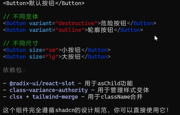 把这个命令复制下来执行一下。我让AI帮我弄一个ShadCN的Button组件,这样AI就完成了代码的编写。这个MCP用起来很方便。