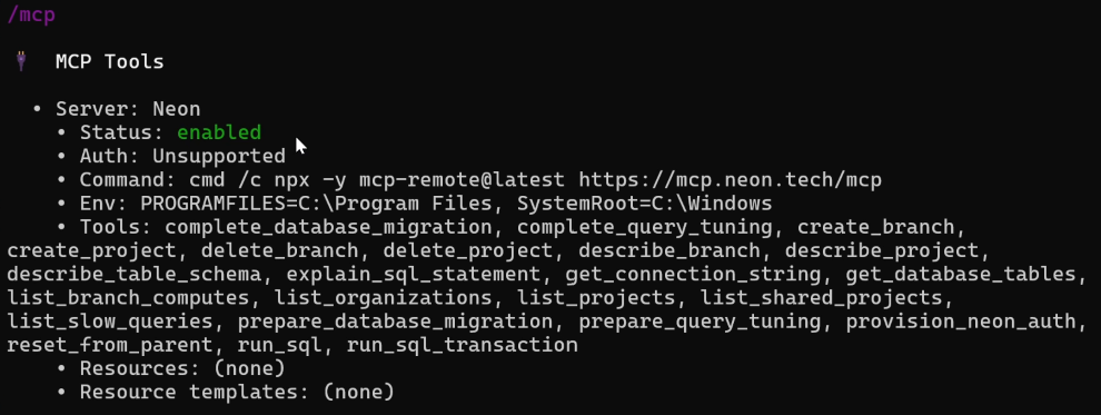 回到Codex,输入命令/mcp,这样Neon MCP在Codex这边也配置完成了。