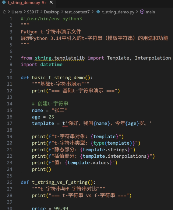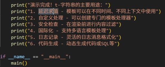 我们看到AI这次写的代码,这是Python 3.14引入的t字符串,也就是模板字符串,下面有它的主要作用,可以进行延迟求值,自定义处理,最重要的一个安全检查,基本上把t字符串的功能都列清楚了,代码生成的很不错。