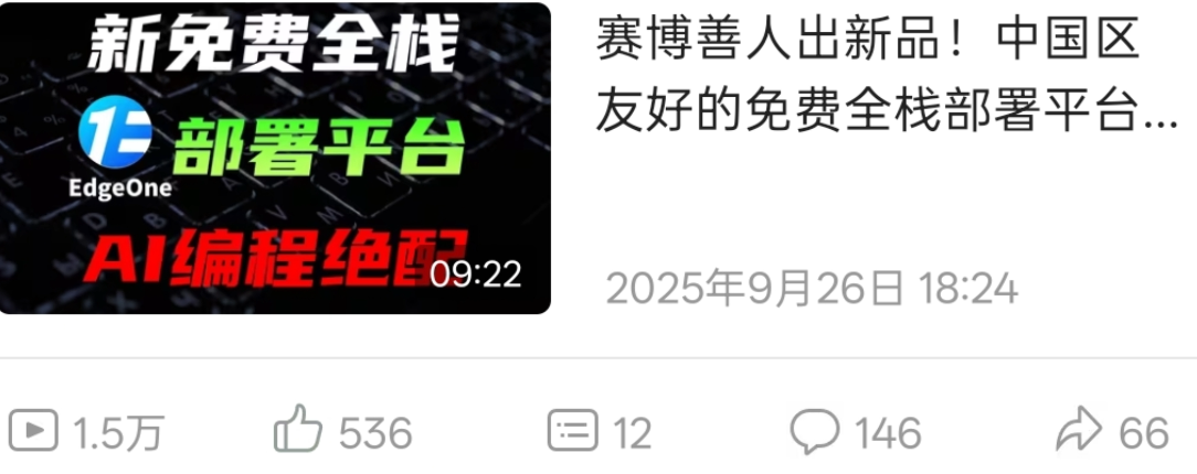 Vercel是一个国外的部署平台,在国内使用可能会遇到各种各样的网络问题。在国内也有一个类似的部署平台EdgeOne Pages,https://console.tencentcloud.com/edgeone/pages,它同样提供MCP工具,可以把项目一键免费部署到EdgeOne Pages上面。在这期视频里面,我对EdgeOne Pages MCP有过详细介绍了,这里我就不赘述了。