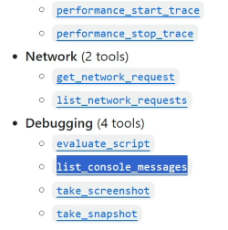 我们看到它调用了MCP工具,打开了Github,找到了搜索栏,然后输入对应的搜索指令,成功搜索到了我们需要的项目,这里也点上了star。除了基础的操作浏览器,它这里面还有一些工具可以帮助我们辅助调试代码,比如可以获取网络请求,然后列出控制台的报错等等。