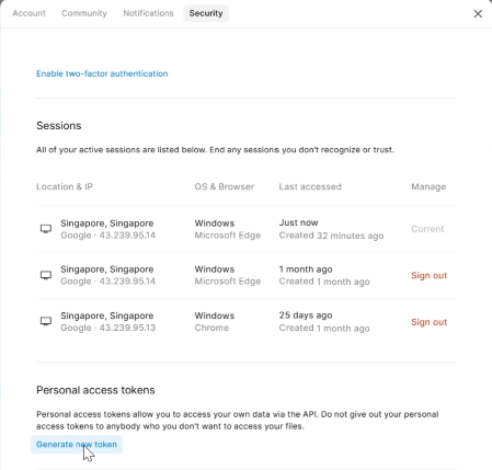 我们回到自己的Figma网站,左上角点击Settings,在Security -> Generate new TOKEN,