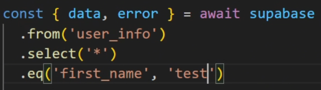 登录用户只能看到属于他自己的数据。有了这个安全保障,我们可以直接把查询语句写到前端代码里面,supabase通过行级的安全策略保障了数据的安全性。我们来写一下查询语句,查询语句非常简单:supabase.from('user_info').select('*').eq('first_name', 'tech')。这里我要查询first_name等于tech的数据,我们来试一下。