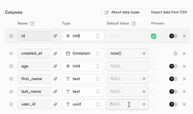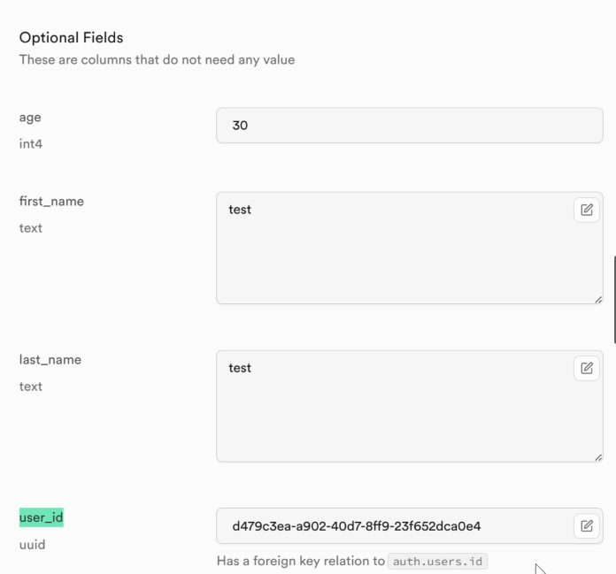 添加我想要的字段,我们先来一个年龄字段,再来一个first name字段,再来一个last name字段。我需要把我的用户信息表跟这张系统表关联起来,所以我需要一个字段把这里的uid填进去。添加一个字段叫做user_id,它的类型选择uuid,跟系统表是一致的。这里随机生成我不需要。