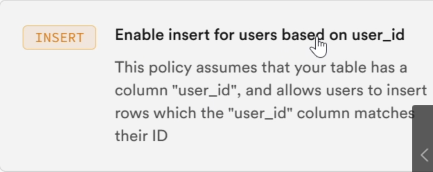 RLS除了能保证数据的读取,还能保证数据的写入。我们再来新建一条策略,create policy。这里我们选中insert,模板的话选择这个,也就是用户只能插入跟自己有关的数据。