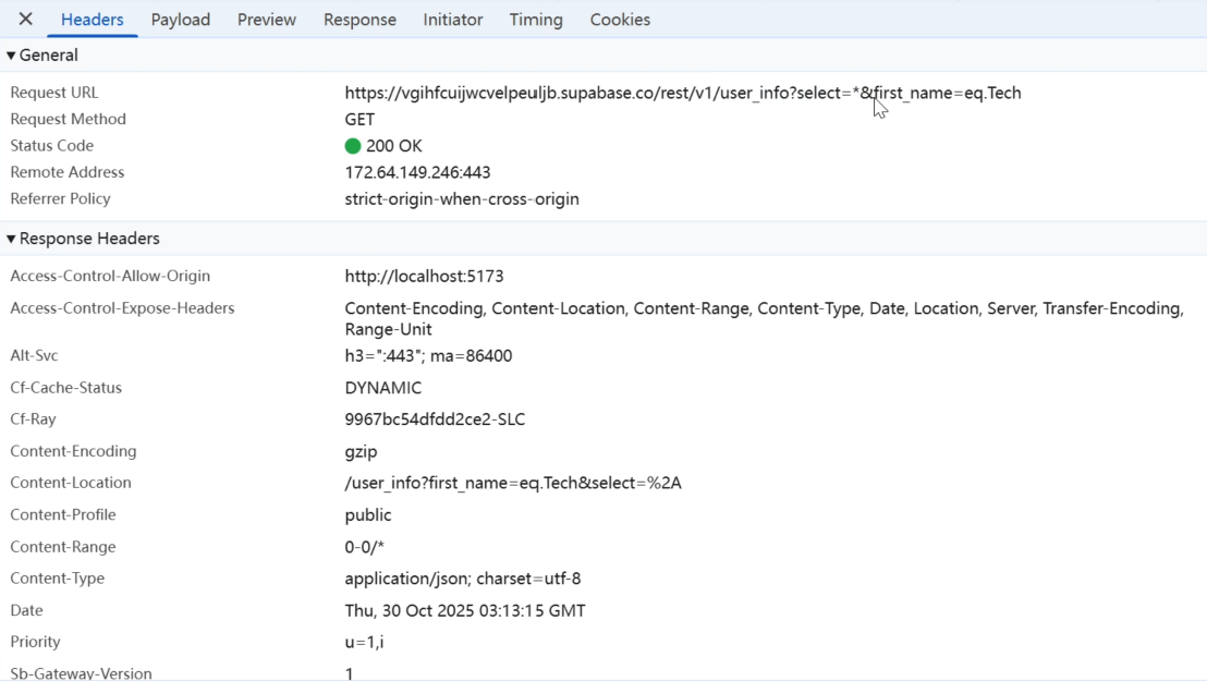 我们在浏览器控制台->network最下面可以看到这次查询的网络请求。Supabase SDK会自动的把这种select的语句转换成http 的get方法,包括表名,然后select的字段,后面的条件都写到了这个get方法里面。