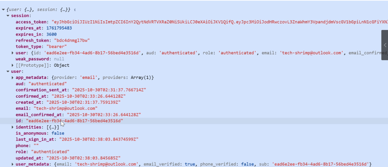 刷新一下页面,在控制台就可以看到打印出来的用户信息,包括这里的session,用户的状态邮箱ID等等的各种信息。