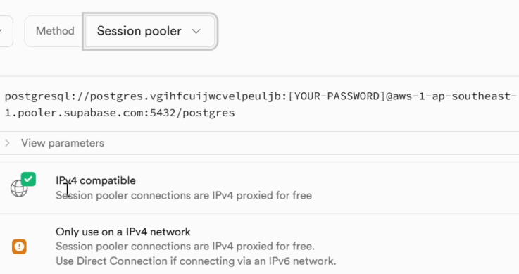 而连接池模式下面,supabase会自动为我们维护连接池,从而显著降低数据库连接的压力,特别适合一些无状态服务,比如无服务器函数或者边缘函数,他们都是按需启动,不用时就销毁,没有能力长时间维护一个连接池,这时候就应该选择transaction pooler模式,让supabase来负责维护连接池。