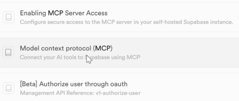 supabase下一个重要功能是MCP。我们来到文档站,搜索MCP,找到第二个。