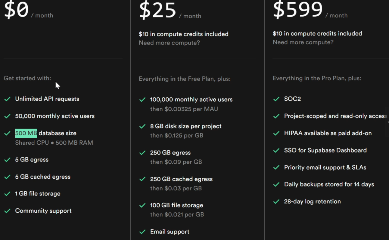 我们使用的这个云服务版本,免费用户的最大存储空间有一定的限制:数据库最大使用500 MB,然后存储桶最大可以使用1GB。如果空间不够,我们当然也可以进行本地部署,视频的最后我会介绍如何进行本地部署。