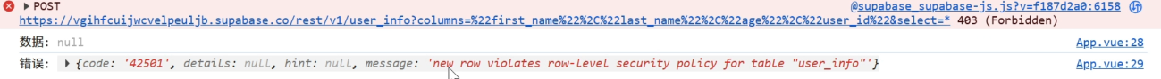 我们的行级安全策略约定了用户只能插入跟自己有关的数据,如果我改一下user_id,看看能不能去插别人的ID。刷新一下页面,看一下控制台,这里报了403 forbidden。