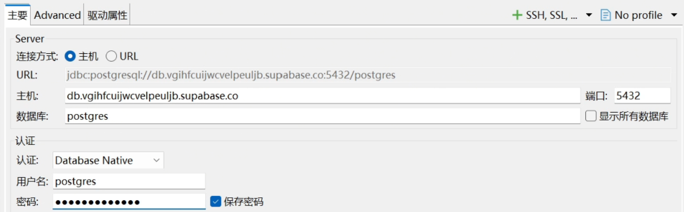 新建数据库连接-->选择postgres,主机我们填写这一串,端口5432,数据库名与用户名都不用改,密码填写我们创建Supabase项目时候的密码,点击完成。