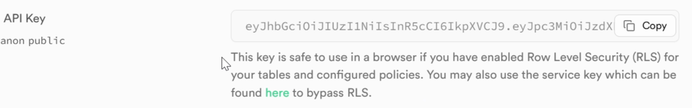 这里说这个key在浏览器里面使用是安全的,如果你启用了RLS,也就是行级安全策略,并且正确地配置了你的表。虽然把API Key直接放到前端去用有点反直觉,但这其实是supabase的一个强大特性,也就是RLS行级安全策略,它保证了我们即使在前端跟数据库交互,也能确保数据的安全。