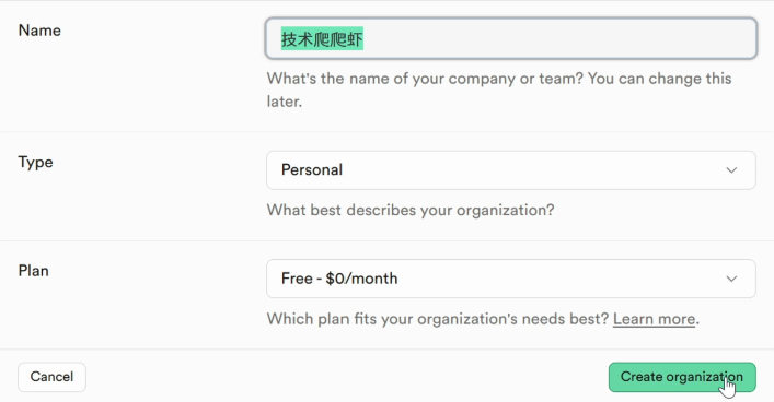 登录完成以后创建一个组织,这里填上我的名字:技术爬爬虾,plan这里选择免费的,创建。