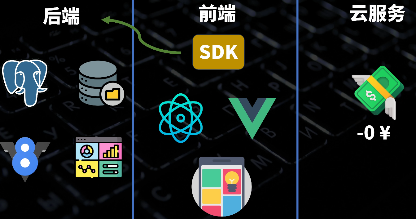 总的来说,Supabase为开发者提供了三大部分的能力:后端、前端与免费的云服务。Supabase在后端提供数据库、文件存储、边缘函数、用户鉴权等各种基础设施。在前端方面,Supabase提供客户端SDK,可以将任何一个前端框架,比如React, Vue,甚至手机APP,用几行代码就可以轻松接入后端。