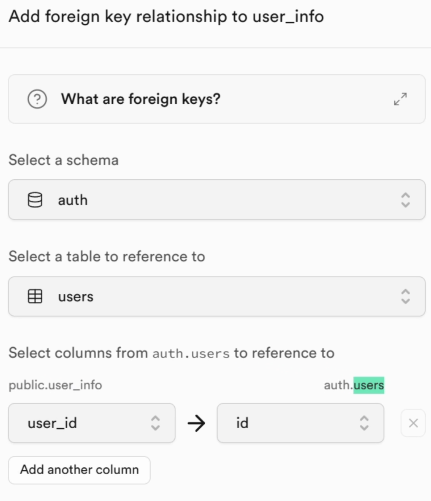 然后在最下面我新建一个外键,需要把我们的user_id跟auth这个schema里面的用户表关联起来。这里左边我选择user_id,右边的关联项选择id,也就是我的user_info表的user_id字段跟系统表的auth.users的id字段,两个形成外键关联,保存一下。