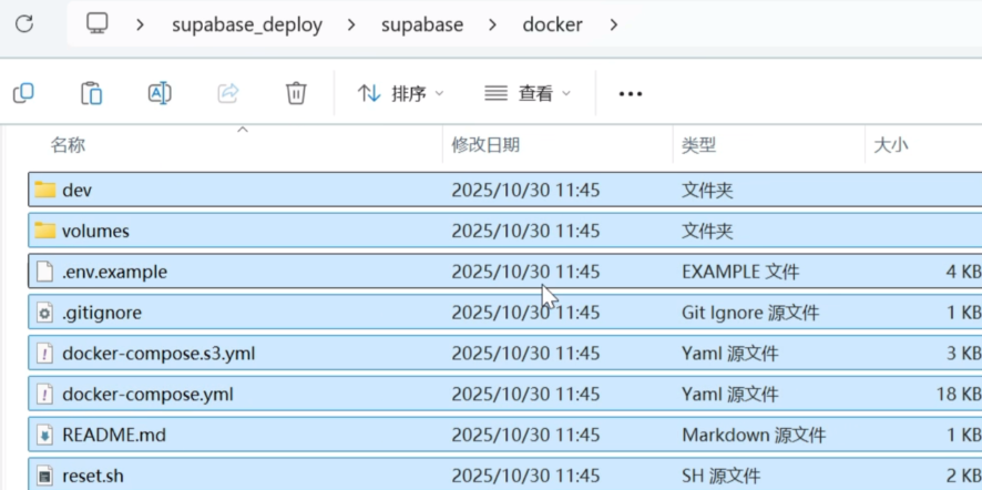 我们来手动拷贝一下,来到这个supabase文件夹,找到docker,把这里面的所有东西复制一下,粘贴到supabase-project文件夹里面。
