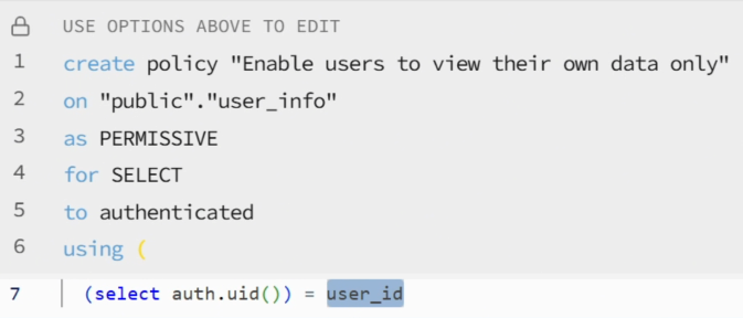 enable user to view their own data。这个模板的意思是登录用户只能读取属于他自己的那一条数据。上面这些都是固定的写法,我们主要看第7行,七行的意思是获取登录用户的ID,这个ID必须跟我user_info表的user_id匹配起来,也就是这个登录用户只能读取属于他自己的那一条数据,这也就是行级安全策略,把它保存一下。