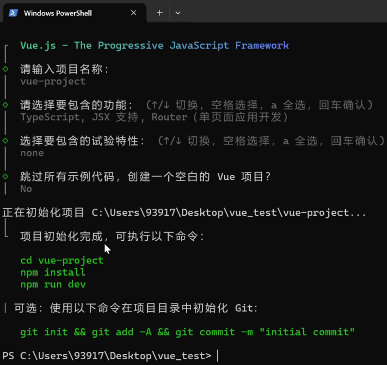 打开一个文件夹,右键在终端打开,进行前端开发。电脑上需要先安装node.js,执行第一个命令初始化一个Vue工程。项目初始化完成以后,我们根据这里的提示再来操作一下