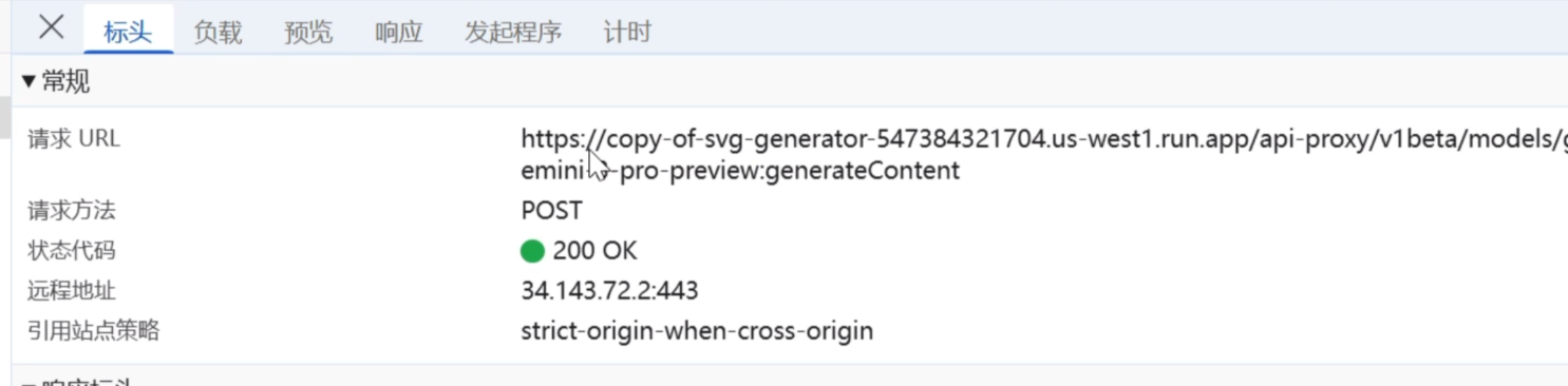 这里它走了项目的api-proxy地址完成AI调用。网站调用AI的时候,浏览器会先请求网站域名下面的API proxy地址,这个请求是发送到了谷歌的网关。然后谷歌的网关接到这个请求以后,把请求转发到Gemini的实际API地址,并且网关会自动附加上创建项目时绑定的API key,从而完成整个调用过程。这样在浏览器那边是看不到 API Key的,也就是谷歌通过它的网关功能保护了我们的API Key。