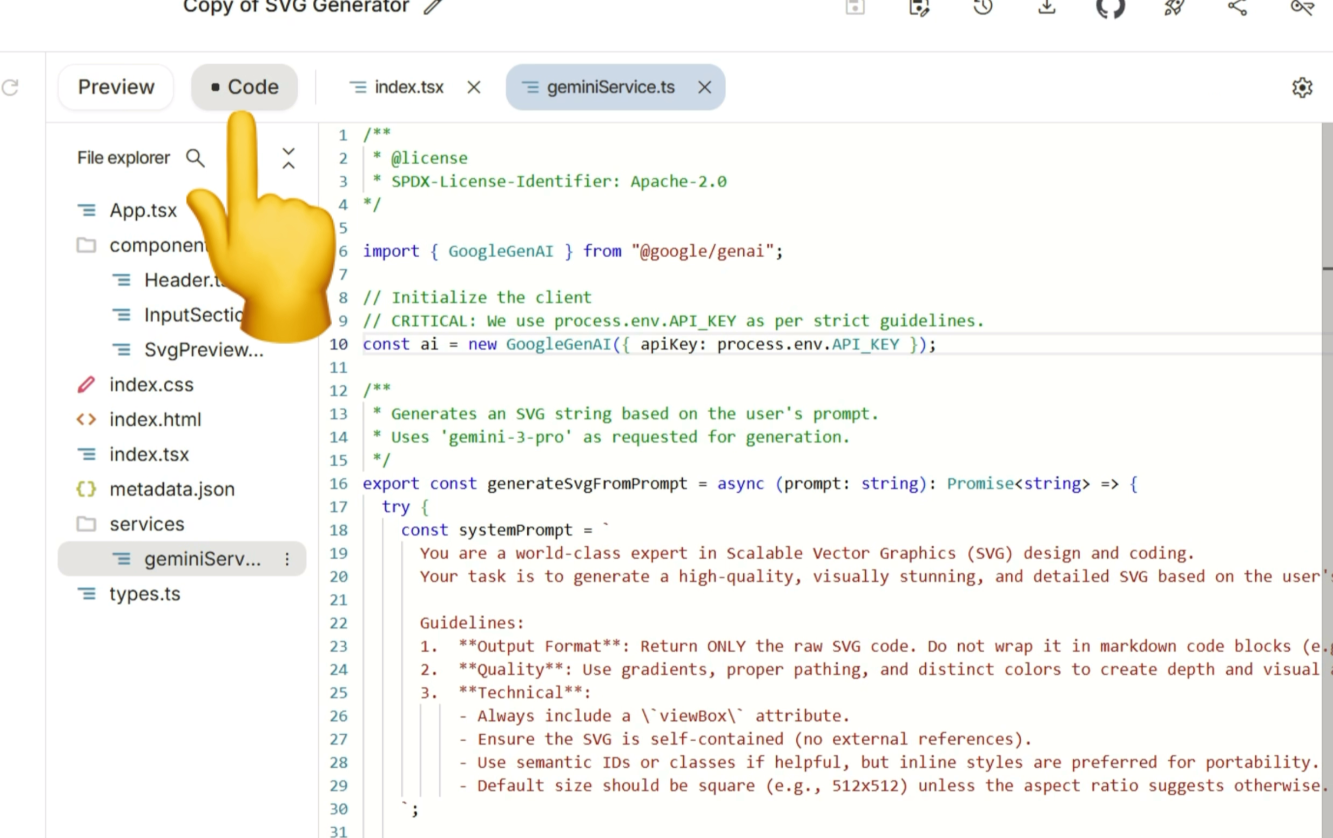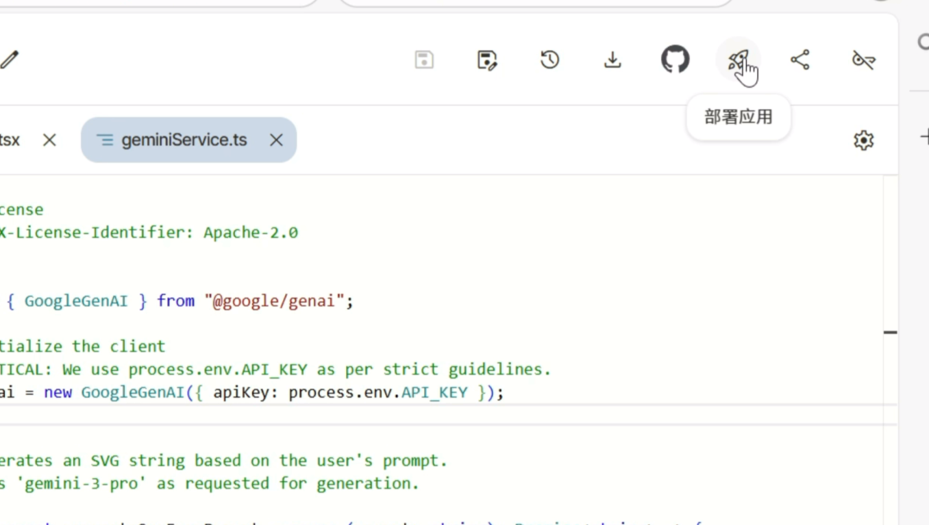 接下来,我们看如何部署有AI功能的应用。这里我还是从官网的样例库,在最下面有一个SVG生成器。这里我们输入一句话,点击“generate”,gemini会调用它的AI功能,为我们生成一个SVG的图片。这样图片就生成好了。
