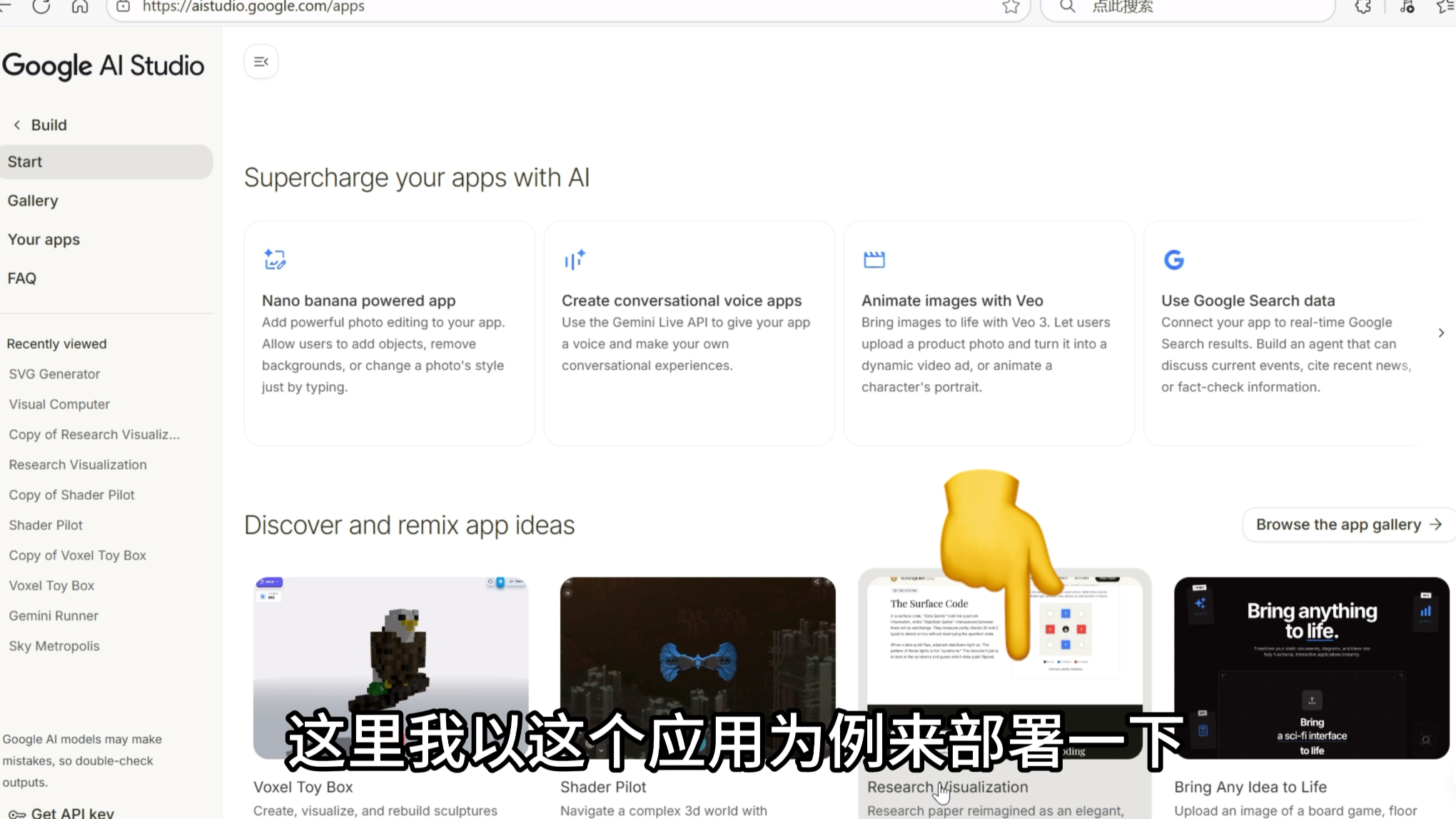 本期视频的重点是部署。我们在下面可以找到一些官方的样例。这里我以这个应用为例来部署一下,应用的名字叫做“研究可视化”。