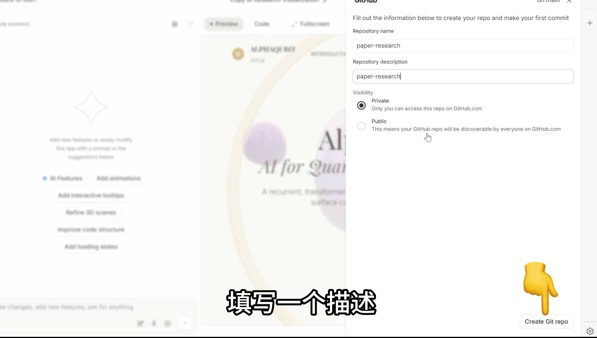 这里,需要先把应用克隆一份到自己的名字底下,点击“保存”。如果没登录过GitHub账号的话,会提示我们先登录一下。然后给仓库起一个名字,填写一个描述,右下角点击“create git repo”,再点击右下角的“stage and commit”。