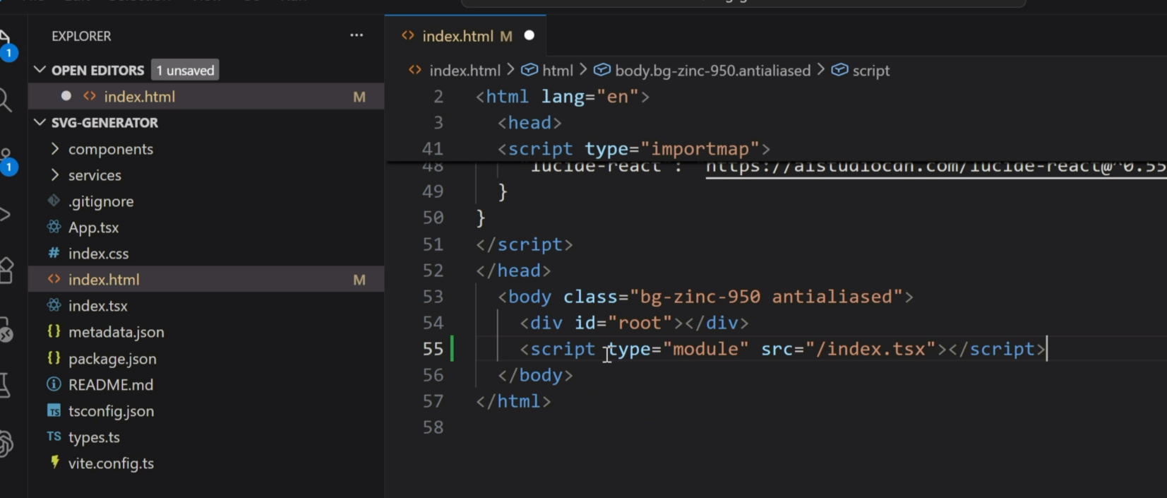 然后找到最下面,这里我们要修改一行代码。这一步是重点,我们需要添加这么一句话,把react的入口文件引用进来。