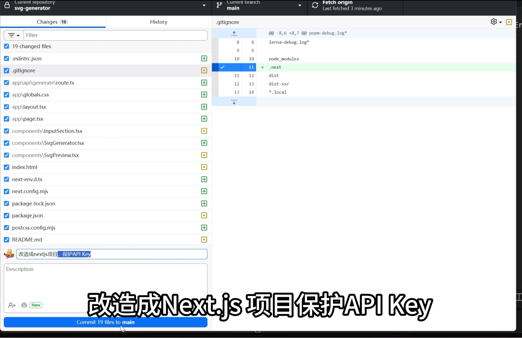 接下来我们把它部署一下。我们回到GitHub Desktop,在这里填一个commit message,我的message是:“改造成Next.js 项目,保护API Key”。然后提交,点击“push origin”,把文件都推送到GitHub上面