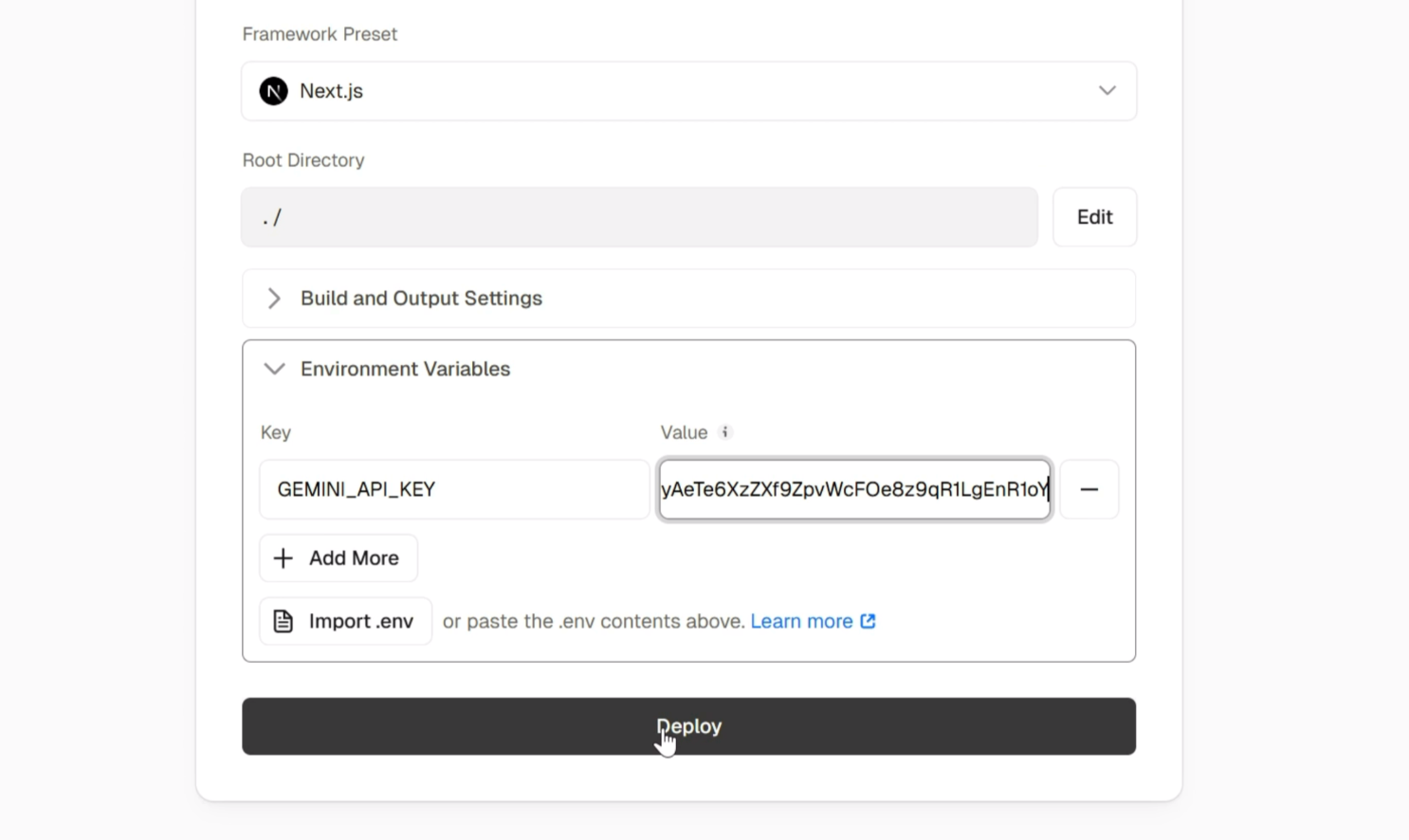 。然后我们还是用Vercel部署一下,“add new--> project”,选到我们的项目,点击“import”。我们看到Vercel已经智能的识别出了目前的框架是Next.js,所以这些配置都不用改。我们只需要在Environments里面把环境变量填写上 GEMINI_API_KEY,值的话,这里要填写一个真实的API Key。