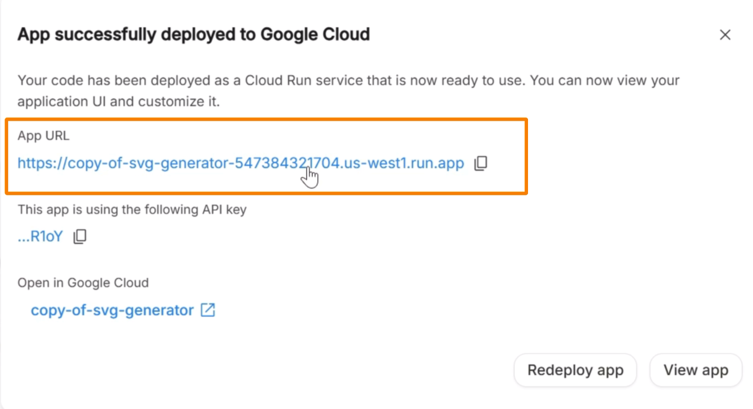 然后点击部署。部署完成以后,它自动生成了一个Gemini的 API Key供项目调用,还生成了一个应用链接。