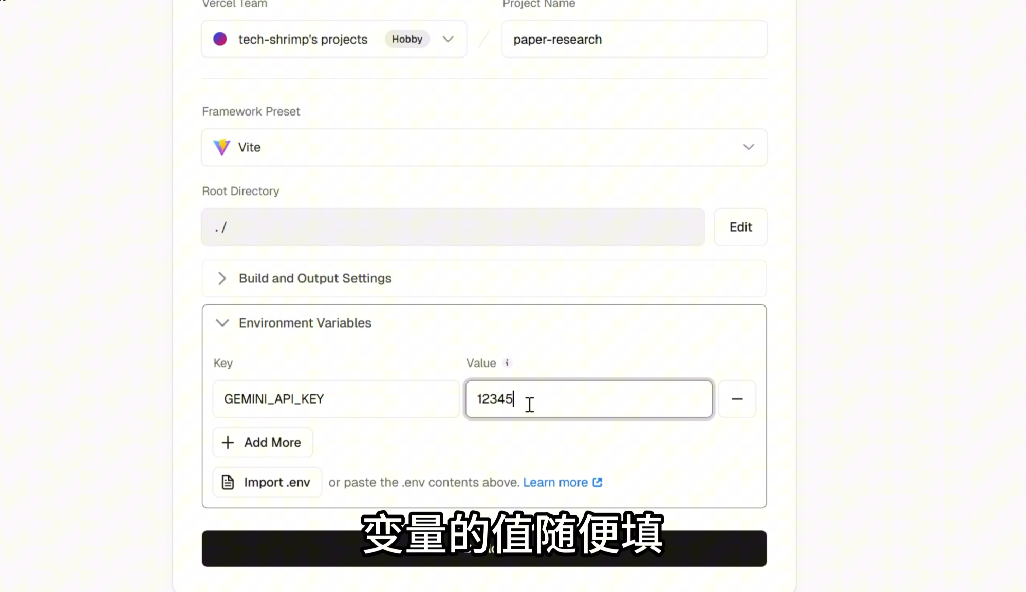 进来以后,右上角点击“add new -->project”。Vercel会自动的识别项目框架,所以这些配置都不需要改。我们展开下面的Environment,填写一个环境变量,变量的名字叫做Gemini API Key,变量的值随便填一个假的占位就可以了。