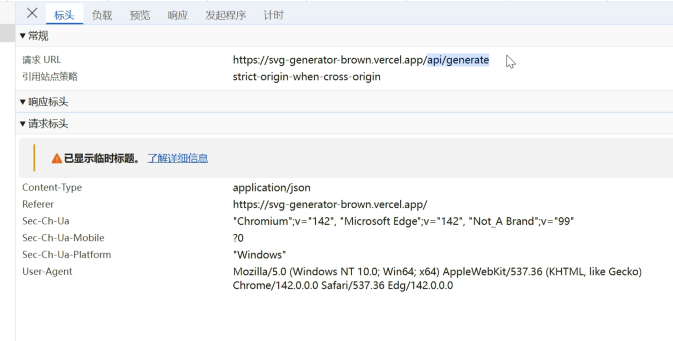好,部署成功了。我们再来试一下,我让他画一个椒盐爬爬虾。我们在浏览器的网络请求可以看到,他调用后台的时候走的是api/generate接口,并且这个请求里他是不携带 API Key的。