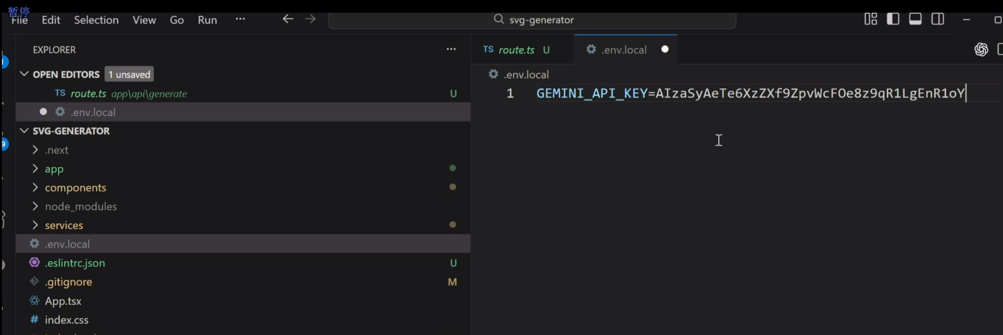 好,我们来测试一下。我们在项目本地新建一个文件,名字叫.env.local,这里填GEMINI_API_KEY=。
