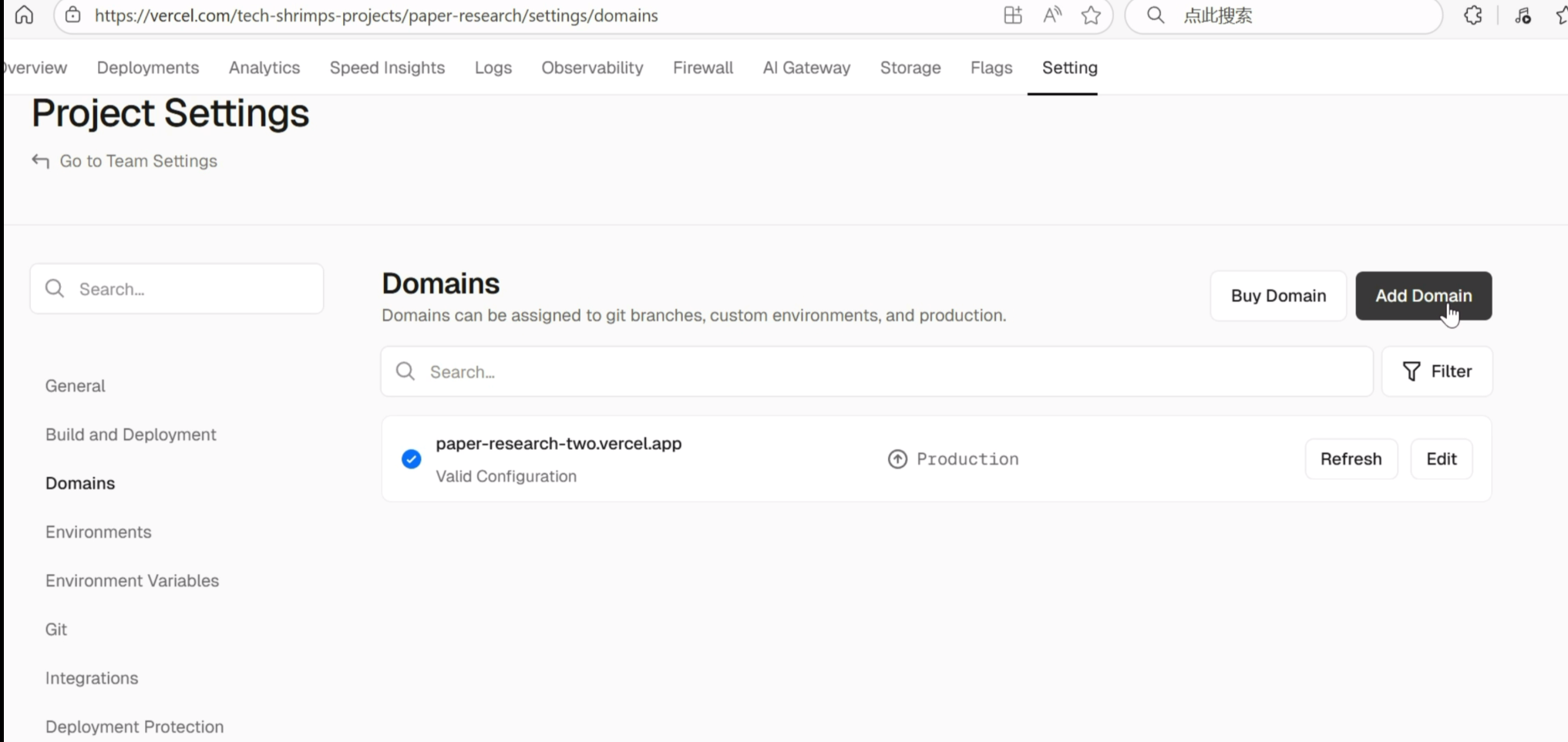 然后来到settings,左边有一个domain,点击这个“add domain”,可以绑定一个自己的域名,用自己的域名在国内就可以访问到了。有的观众朋友们可能没有自己的域名,那也有别的办法。