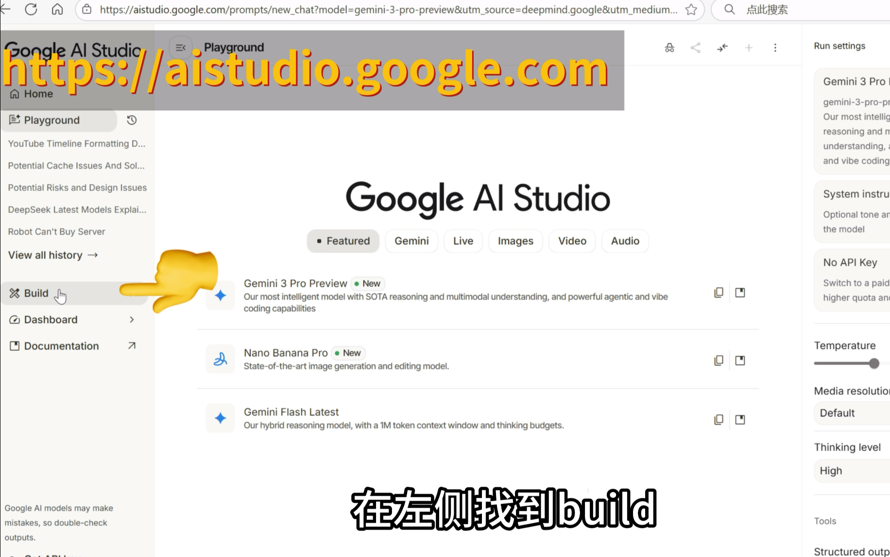 回到aistudio,找到左下角的“Get API Key”。因为项目里面调用的是Gemini 3.0 Pro模型,免费层级是没法使用Gemini 3的,它必须使用第一层级的Gemini API key。在上期视频里面,我详细介绍了怎么获取这么一个API Key。我把这个API Key复制一下,填写到项目里面。
