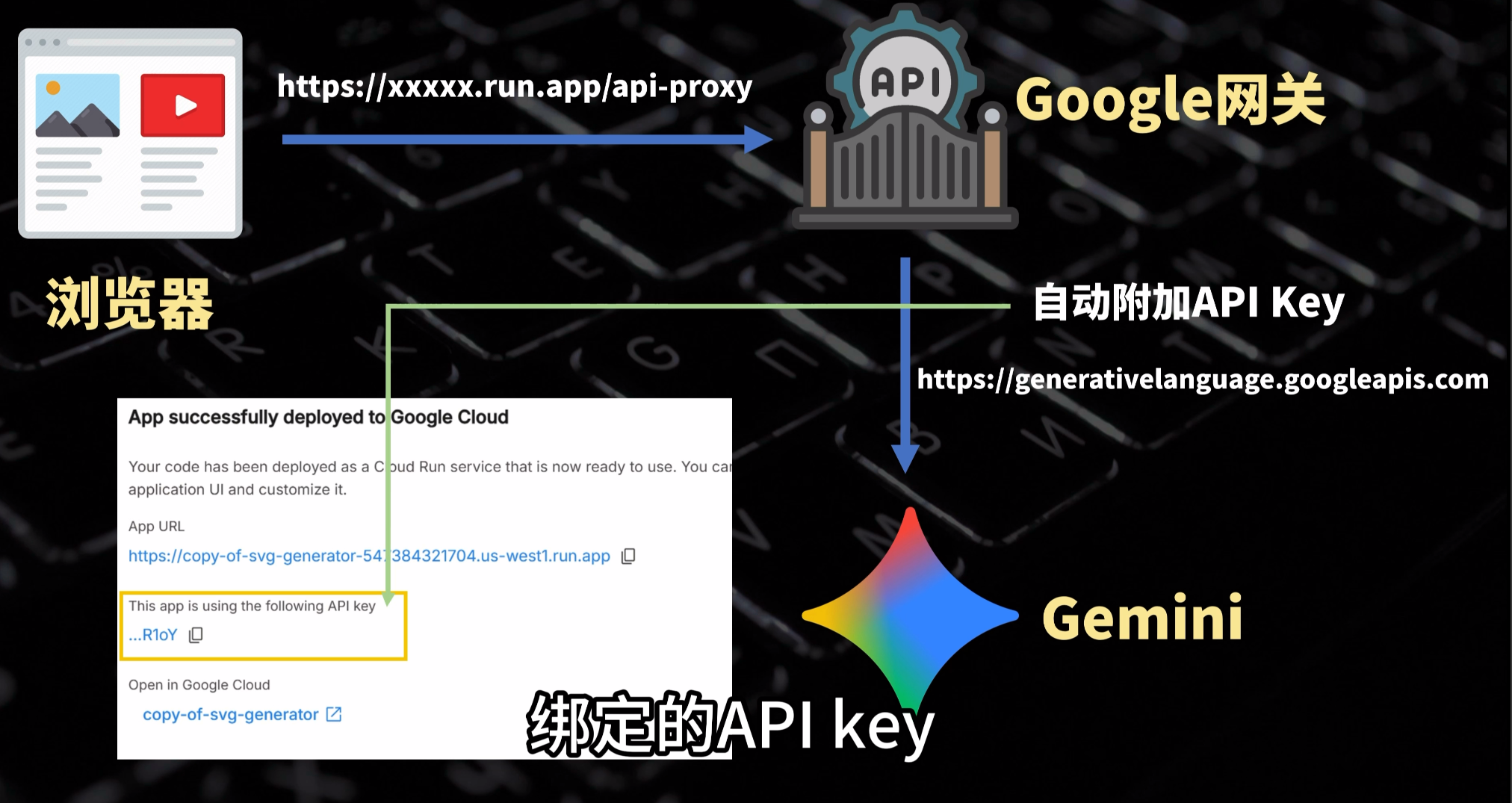 我们还有另外一个方案,就是把项目改造一下,改造成一个前端加后端的完整应用,从后端调用Gemini的API。我们的API key只存放在网站的后端,这样也可以保护API key。