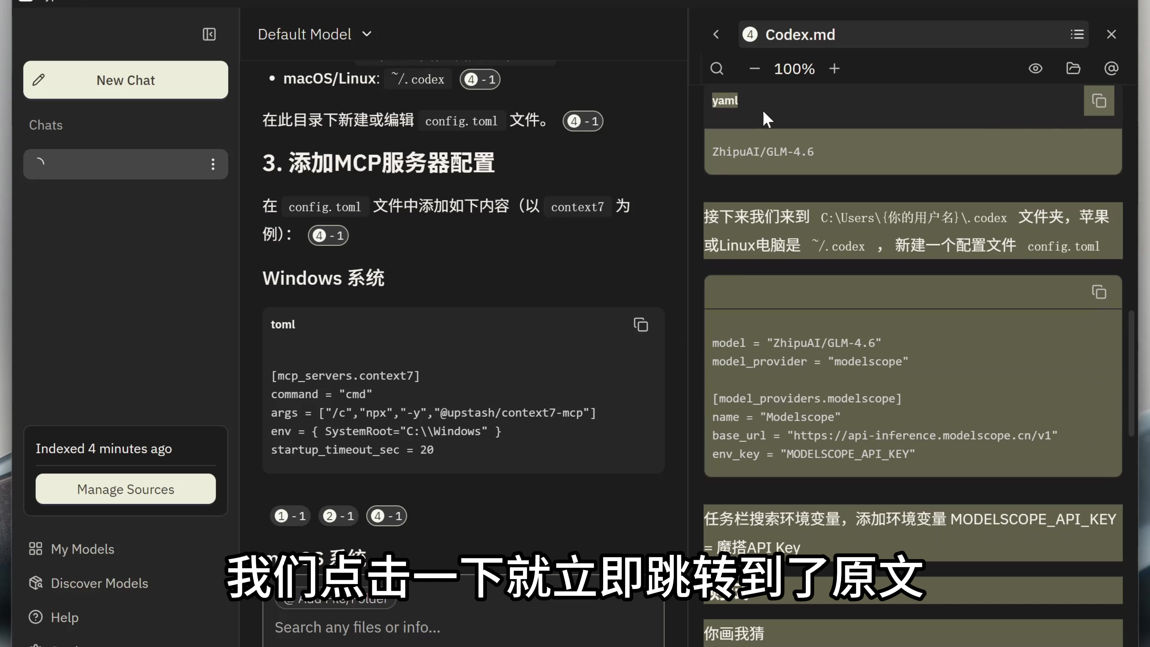 我的第一个问题是:“Codex怎么配置MCP?” 这里看到,Hyperlink成功检索到了我之前记录的笔记文案,并且输出了答案。在答案下面还有一个引用链接,我们点击一下就立即跳转到了原文。