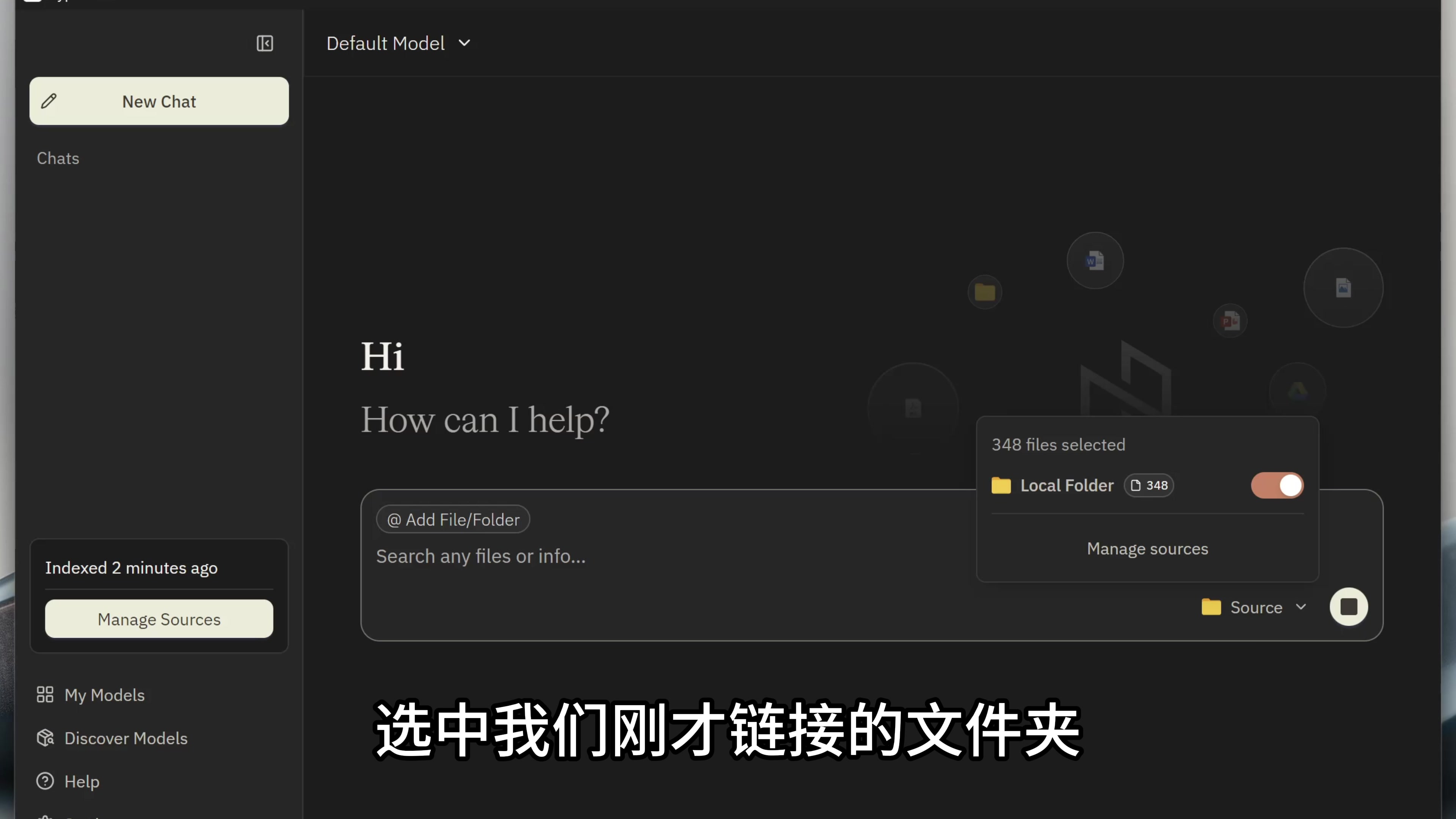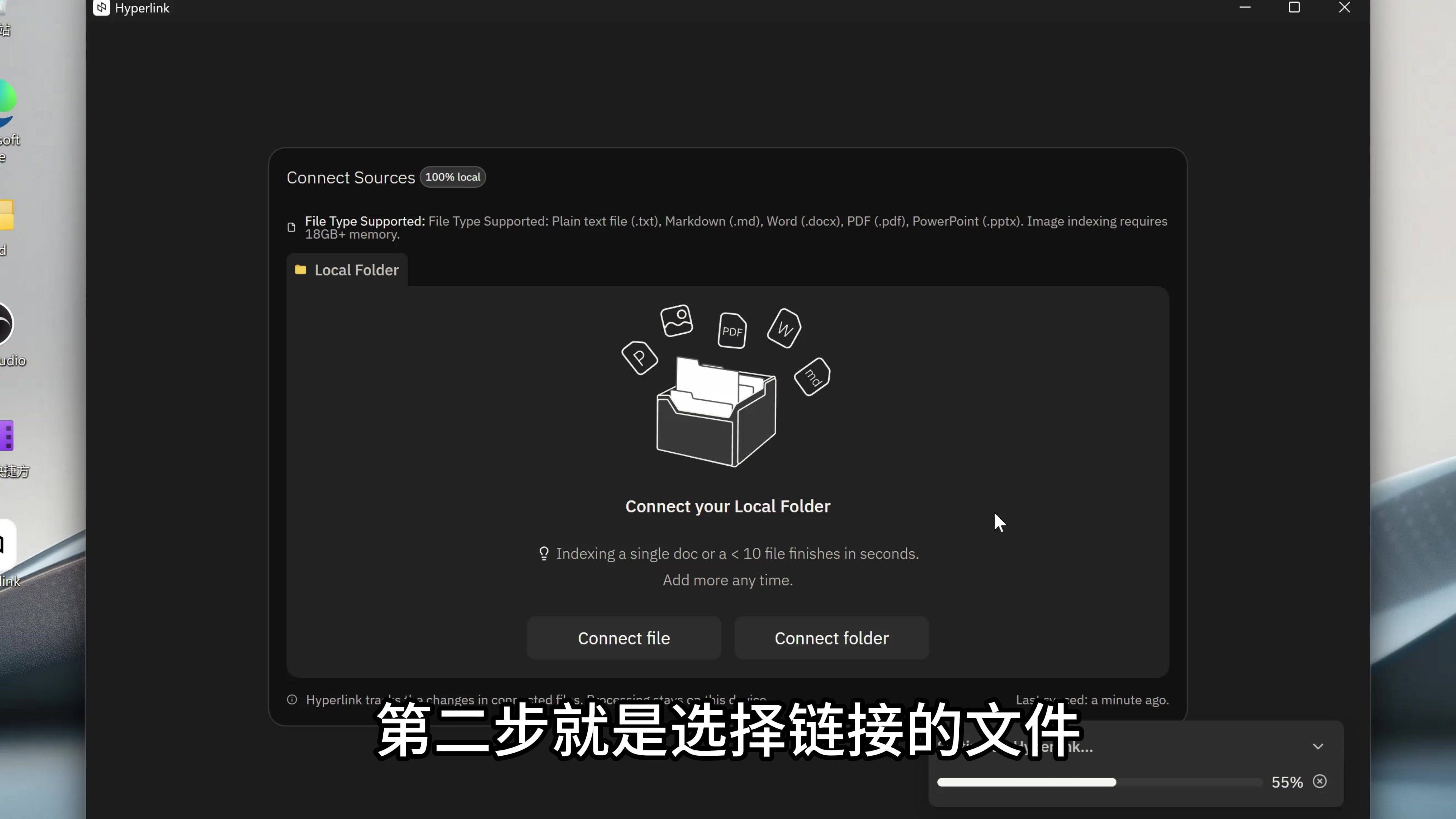 这里我选择obsidian_note文件夹,里面存储了我最近几年记录的所有知识类的笔记,我准备把这些笔记链接进Hyperlink,当做AI知识库使用。Hyperlink会为这些文件创建本地索引,文件夹里面所有新增/修改的文件,都会自动同步索引。文件索引、查找、整理答案,这些都是本地计算的,不会上传到任何云存储,保证了这些文件的私密性。Hyperlink管理的文件数量没有最大限制,一次可以索引几千个文件。索引完成,点击右下角进入软件。