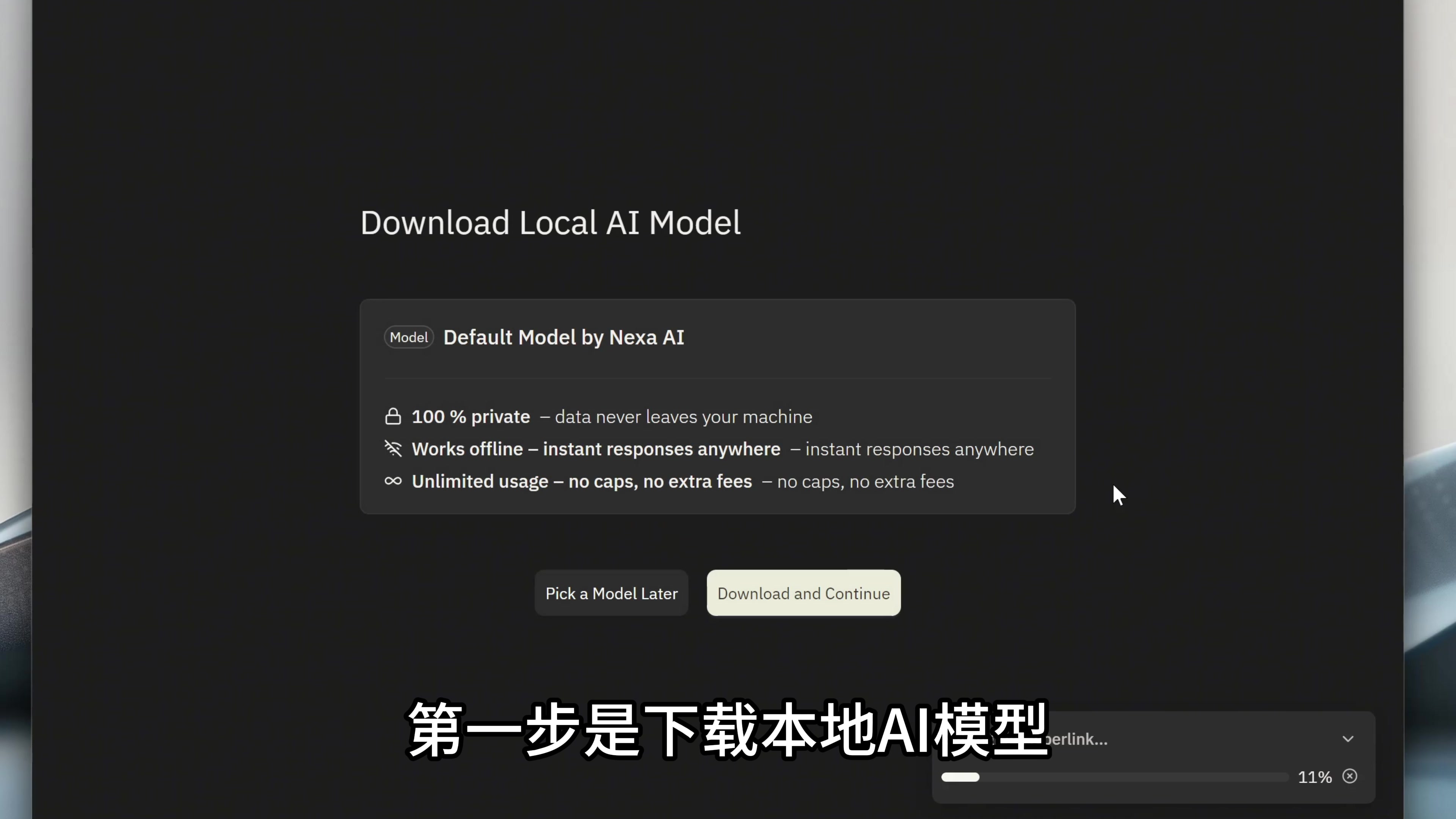 因为要在本地运行大模型,独立显卡需要8GB的显存,集成显卡需要32GB的内存。这次我使用的设备,是搭载了AMD 锐龙 AI9 HX 370的电脑,这款芯片搭载的NPU,拥有50 TOPS的强大AI算力。下载完成以后,双击安装。进入软件以后,第一步是下载本地AI模型。
