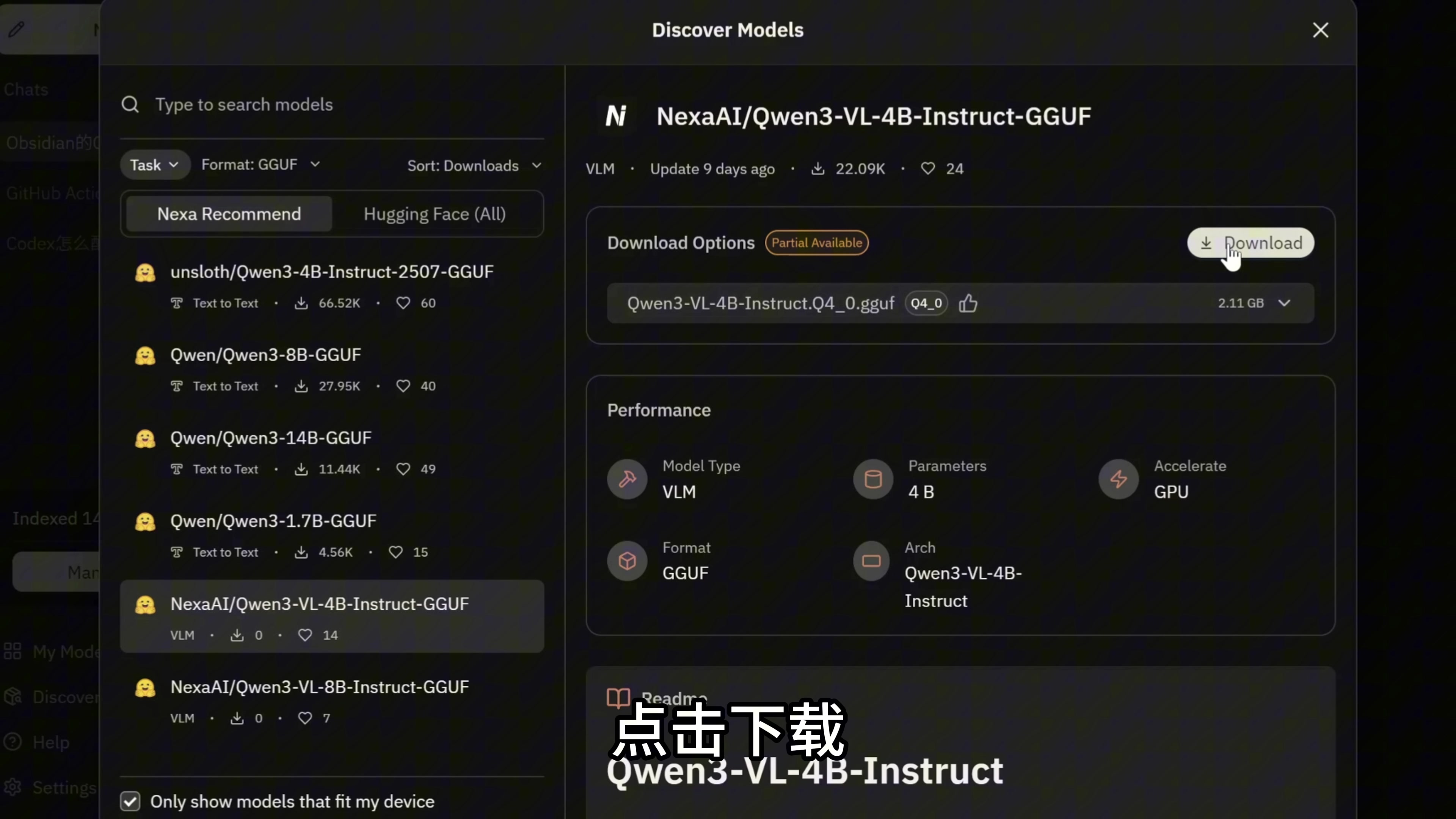 Hyperlink里内置了NexaML推理框架,这是一个比Ollama更强大的本地推理引擎,可以将端侧小模型高效部署在CPU、GPU、NPU等各类算力芯片上。NexaML针对NPU硬件进行了独特设计,能够尽可能地利用到市面上的NPU算力。在PC端、手机端、汽车座舱端、IoT端都可以使用该推理引擎。NexaML拥有在任何后端上支持任意模型的能力。比如说最近,Qwen团队推出了最强端侧多模态模型 Qwen3-VL-4B和8B,模型发布当天,Nexa团队就进行了首发的技术支持。目前还没有其他的本地AI推理框架支持Qwen3 VL 4B/8B,这个最强端侧多模态模型,NexaML是唯一的一个。通过NexaML,Qwen3模型目前可以通过一行代码就在PC上运行起来。如果您是开发者,可以使用Github上的开源项目 NexaSDK 来轻松使用NexaML框架,制作自己的本地AI APP。Hyperlink就是使用NexaSDK做的,并且NexaSDK是市面上最简单易用的端侧AI开发SDK。我们说回到Hyperlink,这里我选择Qwen3-VL-4B模型,点击下载。