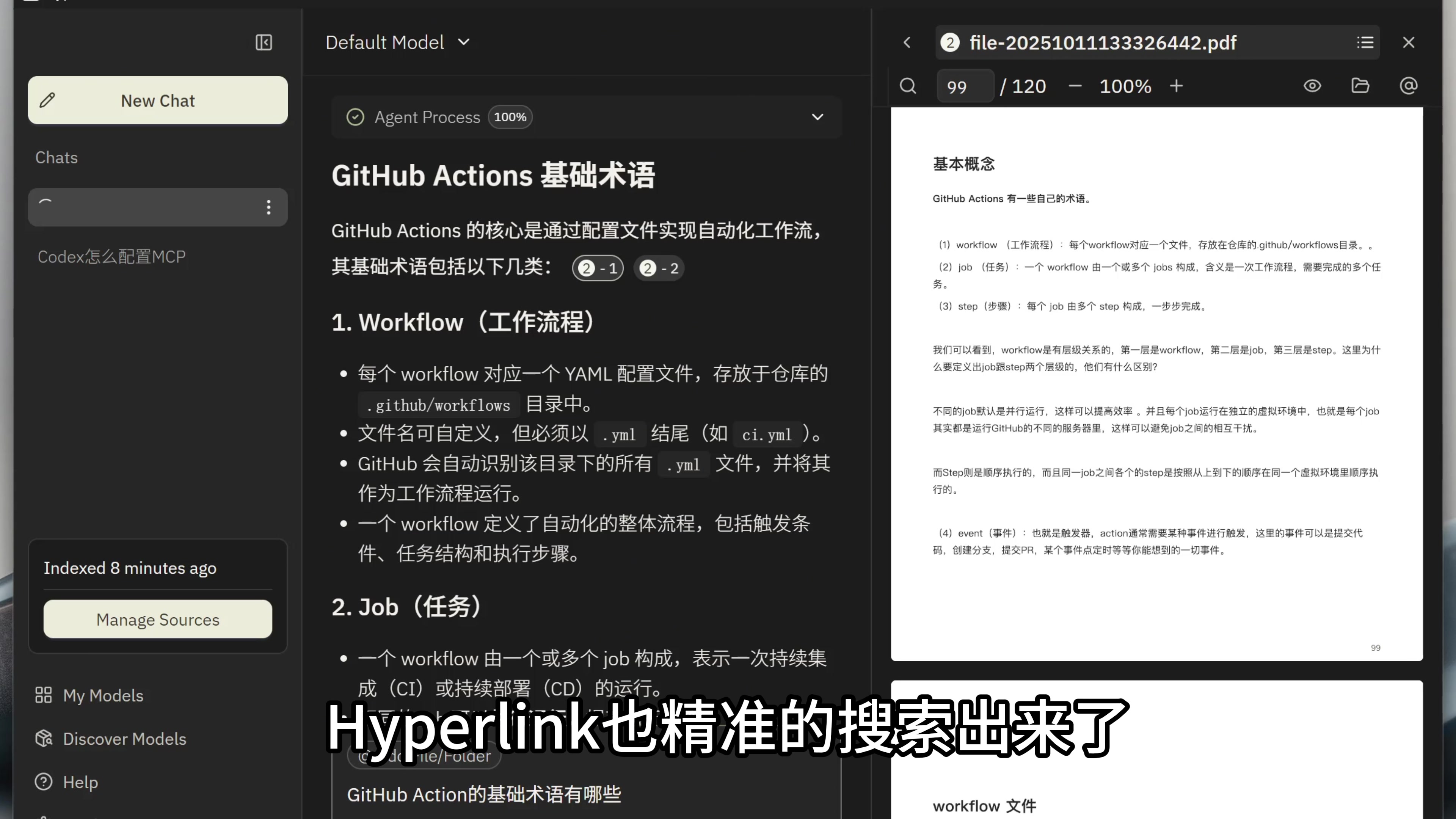 除了能搜索Markdown格式的笔记,还可以检索Powerpoint与PDF格式的内容。我的下一个问题是:“Github Action的基本术语有哪些?” 这是我之前做过的一个视频课的教案,这个信息是存在一个PDF文档里面的,Hyperlink也精准的搜索出来了。