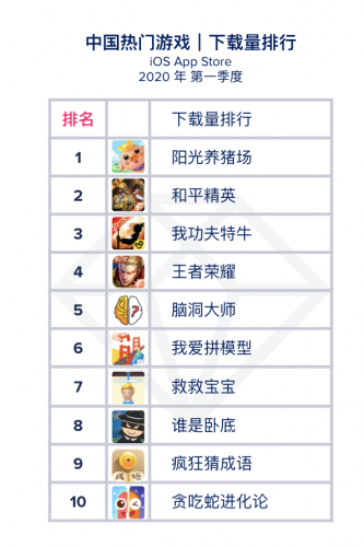 App Annie统计显示,一季度中国热门游戏下载量TOP 10中,腾讯(《王者荣耀》《和平精英》)和字节跳动(《我功夫特牛》《脑洞大师》)旗下游戏几乎占据了前五,而除了《王者荣耀》和《和平精英》两款国民级重度手游之外,其余大多是休闲类游戏。