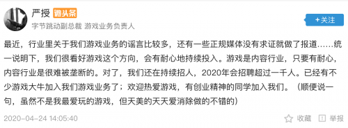 4月24日,严授发布微头条称,字节跳动游戏业务将会在2020年继续招聘超1000人,以满足多条游戏产品线的研发需求。