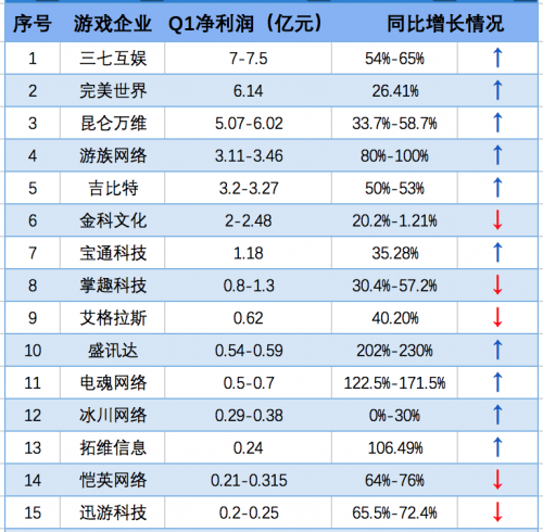 三七互娱是目前A股游戏公司里实现净利润最高的,预计在第一季度盈利7亿至7.5亿元,同比增长54%到65%。完美世界和昆仑万维紧随其后,盈利均在5亿元以上。前5名中,游族网络净利同比增长最多,达到80%至100%。