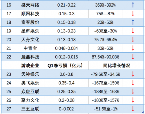 TechWeb统计的27家A股游戏公司一季度业绩预告显示,22家企业预计在第一季度实现盈利,占比达到81.5%。其中,三七互娱、游族网络等7家企业净利润增幅预计在50%以上。