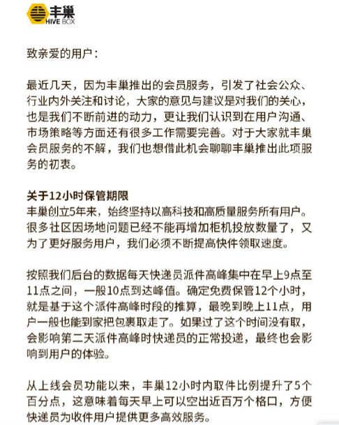 根据丰巢公布的数据,在上线会员功能之后,12小时内取件比例提升了5%,每天早上可以空出百万个格口,大大提高了周转率。不过,在这份最新的回应中,丰巢对收费的问题只字不提。