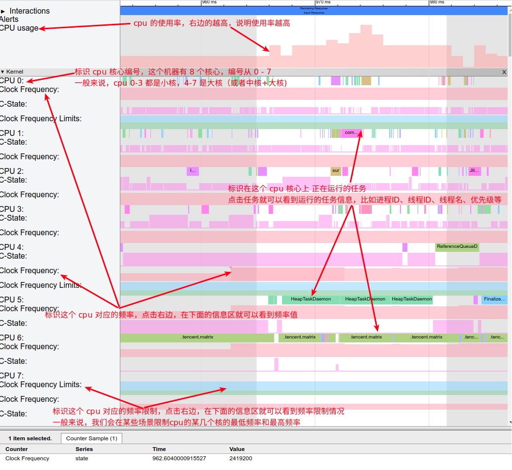 Systrace 中 CPU Info 一般在最上面,里面经常会用到的信息包括: