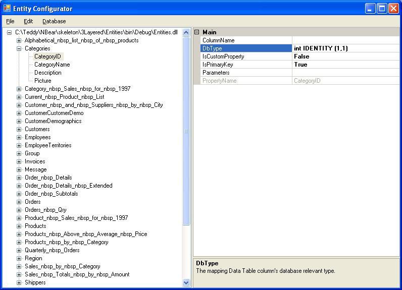 下面,我们使用Entity Configurator工具载入(从菜单选择File-〉Load-〉Load Assembly)编译后的包含以上实体的程序集,修改实体及实体属性的元数据,如果需要生成数据库创建脚本,则一定要设置每个实体属性的DbType属性,指定生成的数据库表中对应列的数据类型。配置完成后,可以使用File-〉Save Config将配置信息保存到config文件(可以直接保存到应用程序的Web.config或App.config,工具只会添加实体配置代码,不会删除config文件中的其他代码)。