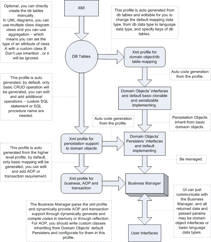该方案以数据库表为基础,提供从XMI生成Tables的工具,支持UML类图到Tables自动生成。基于Tables生成Xml Profile,框架辅助工具据此生成DomainObjects和Persisters的接口与实现。还能自动生成默认的Xml Profile,由Business Manager解析执行,特殊业务可用AOP处理。